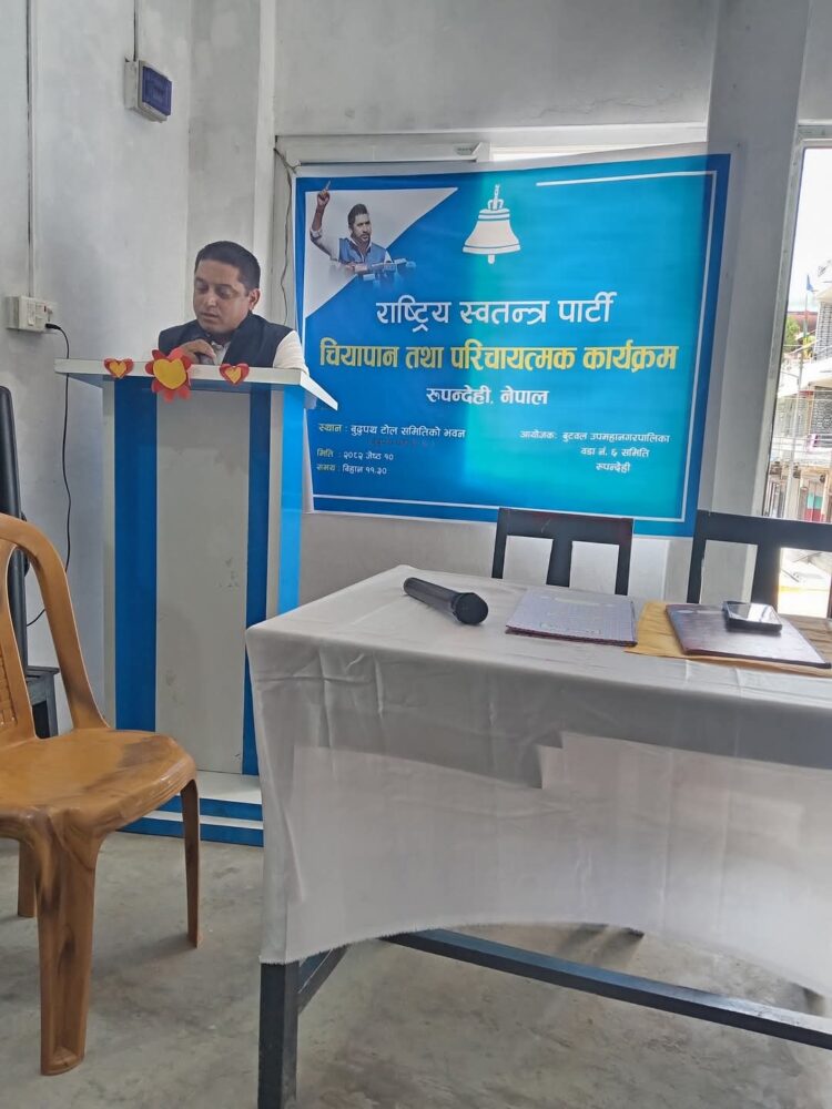 राष्ट्रीय स्वतन्त्र पार्टी बुटवल उपमहानगर स्थित वडा नम्बर ६ वडा समिति को आयोजनामा चियापान तथा परिचयात्मक कार्यक्रम सम्पन्न गरेको छ। राष्ट्रीय स्वतन्त्र पार्टीका केन्द्रिय , प्रदेश, जिल्ला एव क्षेत्र र विभिन्न नगर का नेतागण को बाक्लो उपस्थिति रहेको थियो।