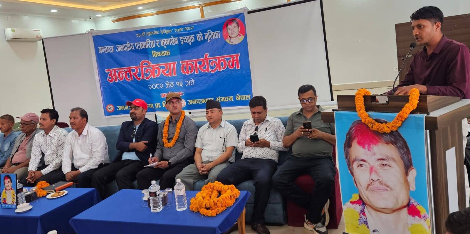 नेपाल पत्रकार महासंघका महासचिव रामप्रसाद दाहालले देशलाई संकट पर्दा पत्रकार चाहिने गरेको बताउंदै गणतन्त्र नेपाल पत्रकार महासंघको पूंजी भएकाले गणतन्त्रलाई दीगो बनाउनु पर्नेमा जोड दिए । कृष्णसेन इच्छुकले देखाएको बाटोलाई आत्मसाथ गर्नुपर्ने बताए ।