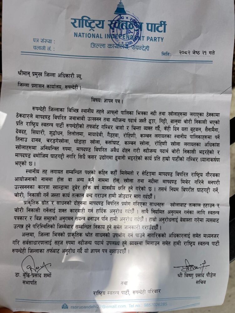 राष्ट्रिय स्वतन्त्र पार्टी रुपन्देहीले नदी तथा खोलाहरूमा लगाएका ठेक्कामा ठेकदारले मापदण्ड विपरित जथाभावी उत्खनन तथा नदीजन्य पदार्थ चोरी निकासी गरेको भन्दै आज जिल्ला प्रशासन कार्यालयमा ज्ञापनपत्र बुझाएको छ ।