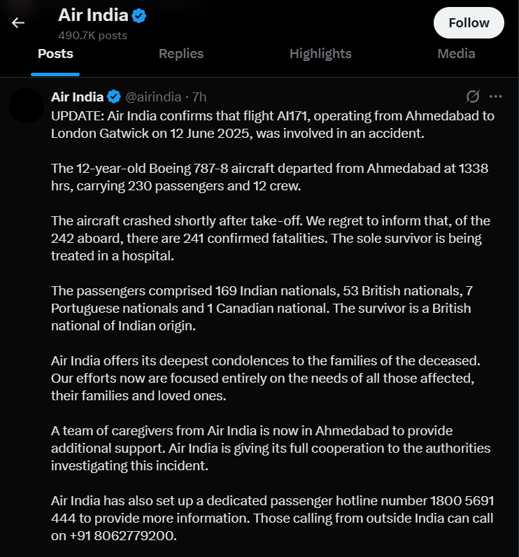 भारतीय गृहमन्त्री अमित शाहले पनि विमानमा रहेका कुल २४२ जनामध्ये एक जना मात्र बँचेको र उनीसँग आफूले कुराकानी गरेको जानकारी पत्रकारहरुलाई दिएका छन् । विहीबार दिउँसो भारतीय समय अनुसार २ बजेर ३८ मिनेटमा अहमदावादबाट बेलायतको लण्डनका लागि उडेको एयर इन्डियाको बोइङ ७८७-८ विमान २ बजेर ४० मिनेटमै खसेर आगो लागेको थियो । टाटा कम्पनीको स्वामित्वको सो विमानमा २३० यात्रु र १२ जना ‘क्रु मेम्बर’ (चालक दलका सदस्य) हरु थिए । उक्त दुर्घटनामा एक जना यात्री भने उछिट्टिएर बाँच्न सफल भएका छन् । उनको उपचार जारी छ । ती यात्री भारतीय मूलका बेलायती नागरिक हुन् ।