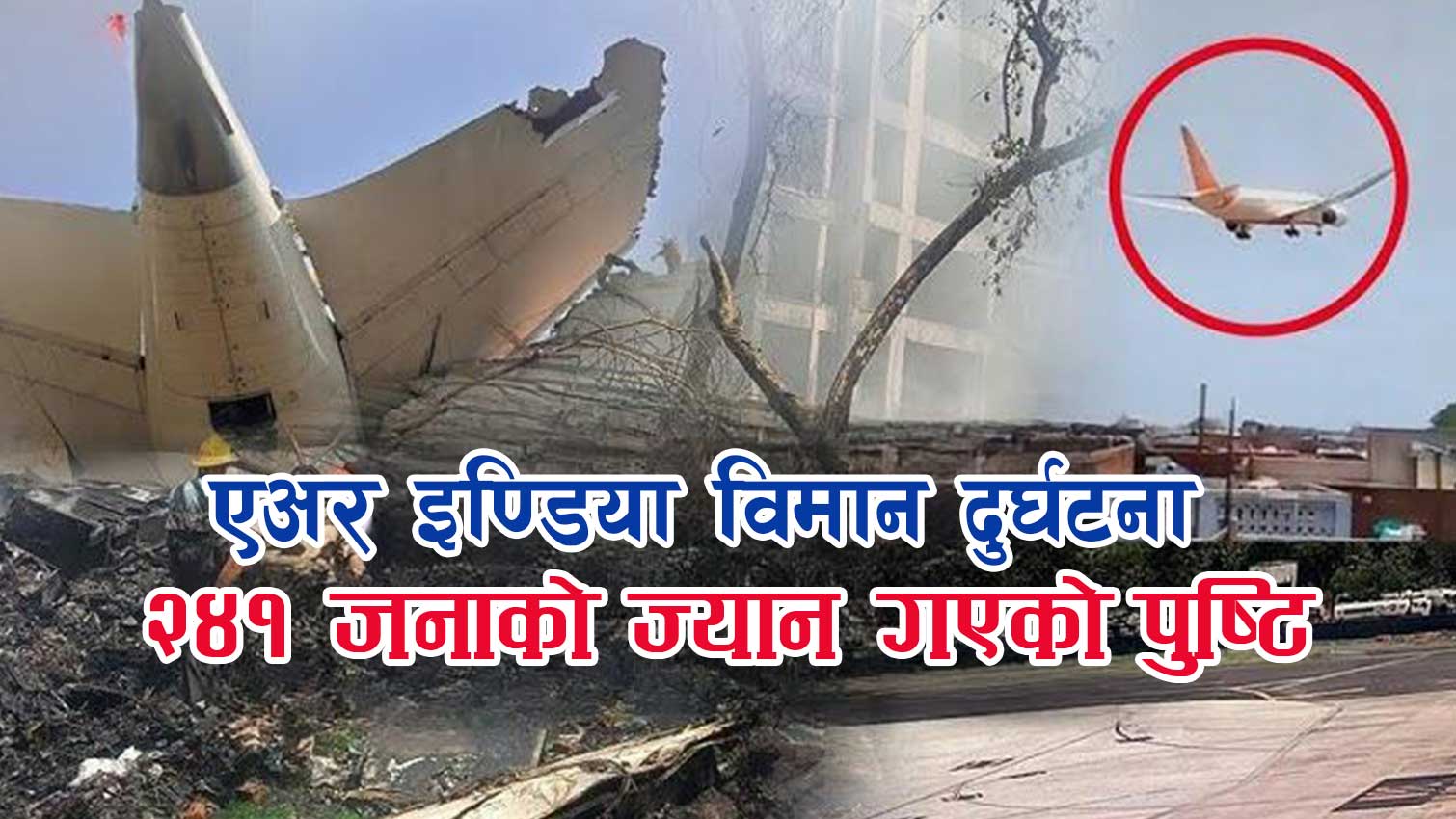 काठमाडौं । भारतको अहमदावादमा एयर इन्डियाको जहाज दुर्घटना हुँदा २४१ जनाको मृत्यु भएको छ । एयर इण्डिया आफैंले सोसल मिडिया एक्समार्फत् यस बारे जानकारी गराएको हो ।