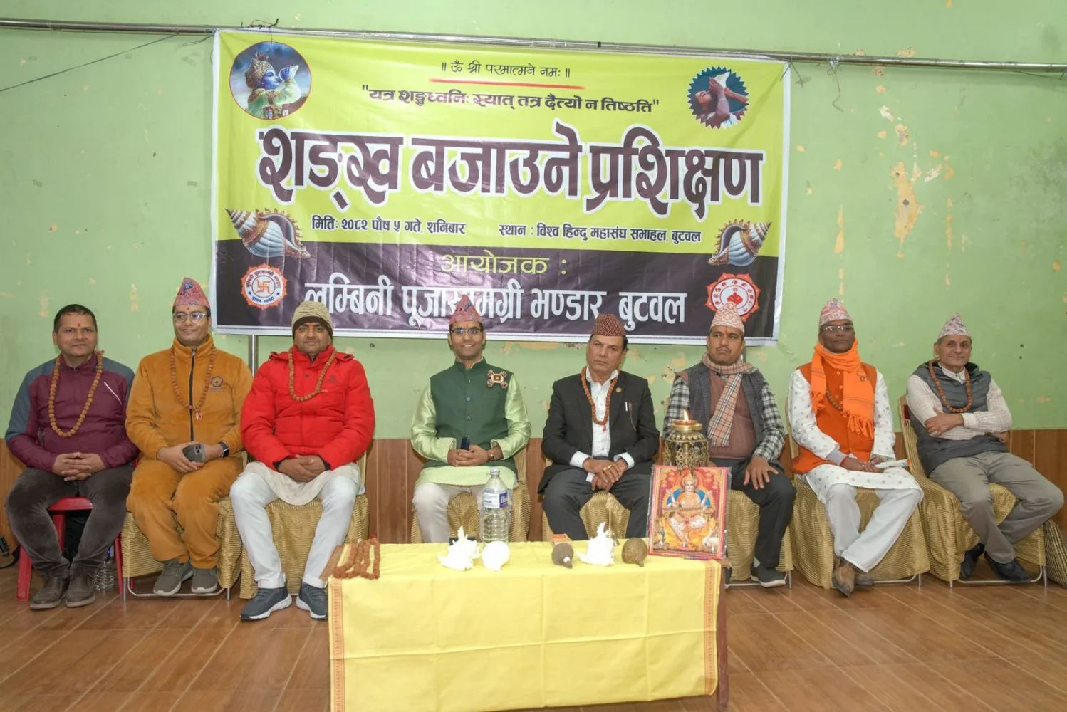 बुटवलमा शंख बजाउने प्रशिक्षण सम्पन्न भएको छ । धर्म, संस्कार कला र संस्कृतिको जगेर्ना गर्ने उद्देश्यका साथ नेपालमै पहिलो पटक लुम्बिनी पूजा सामग्री भण्डार बुटवलद्वारा सामूहिक शंख बजाउने प्रशिक्षण शनिबार भव्य कार्यक्रमका बीच सम्पन्न भएको छ ।